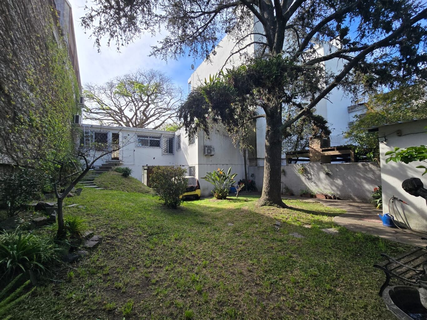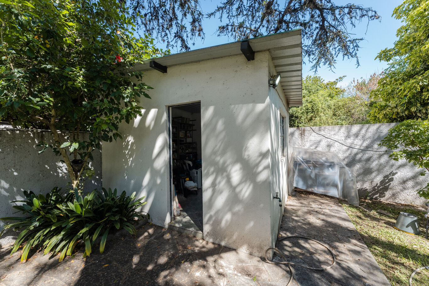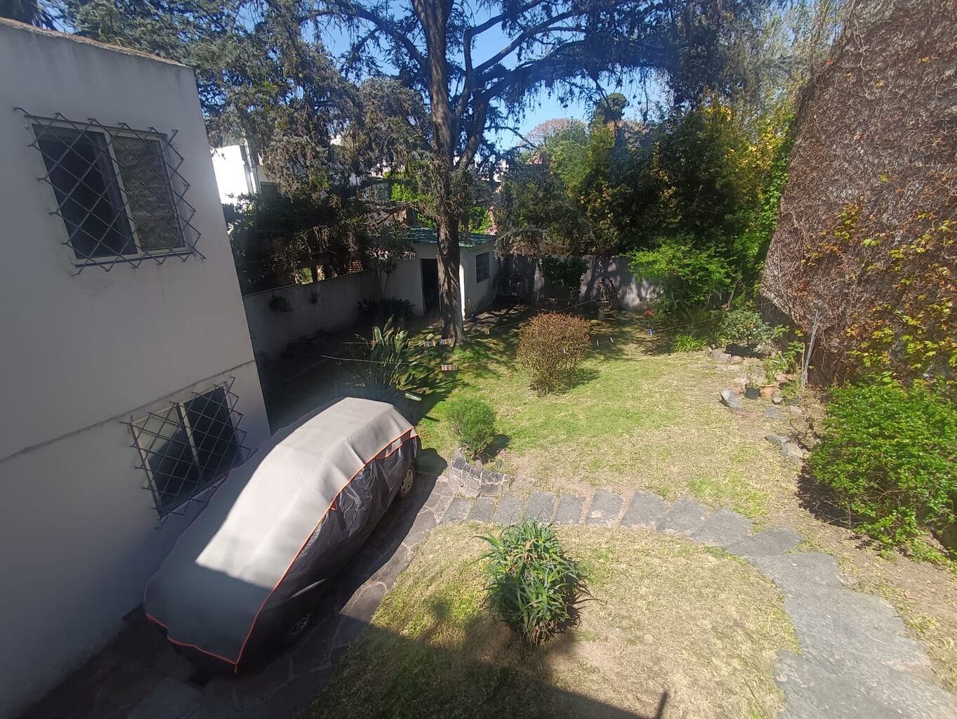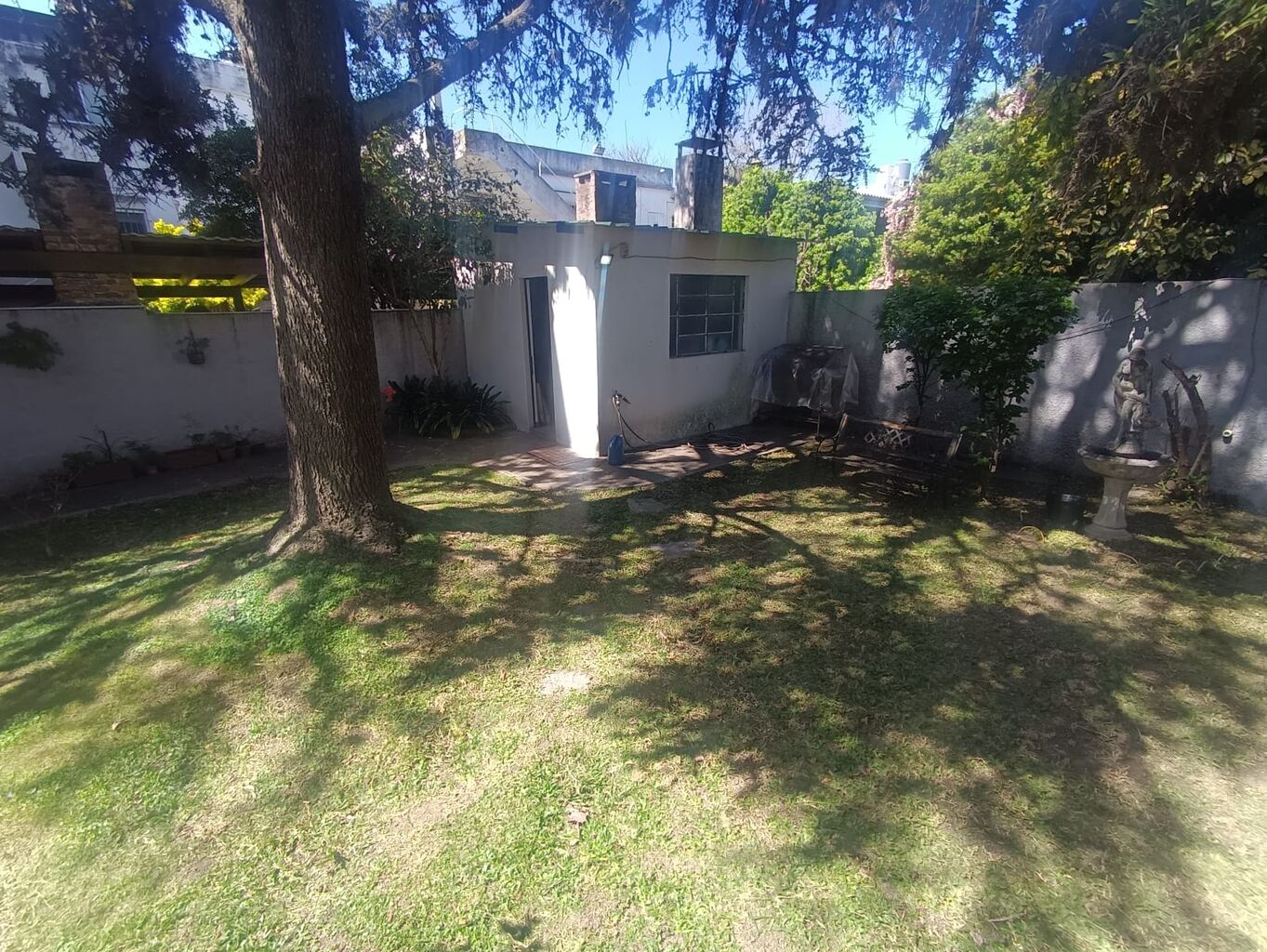 Importantes desahogos verdes de retiro jardin con reja perimetral y muy lindo fondo apaisajado con galpón tipo lavadero.