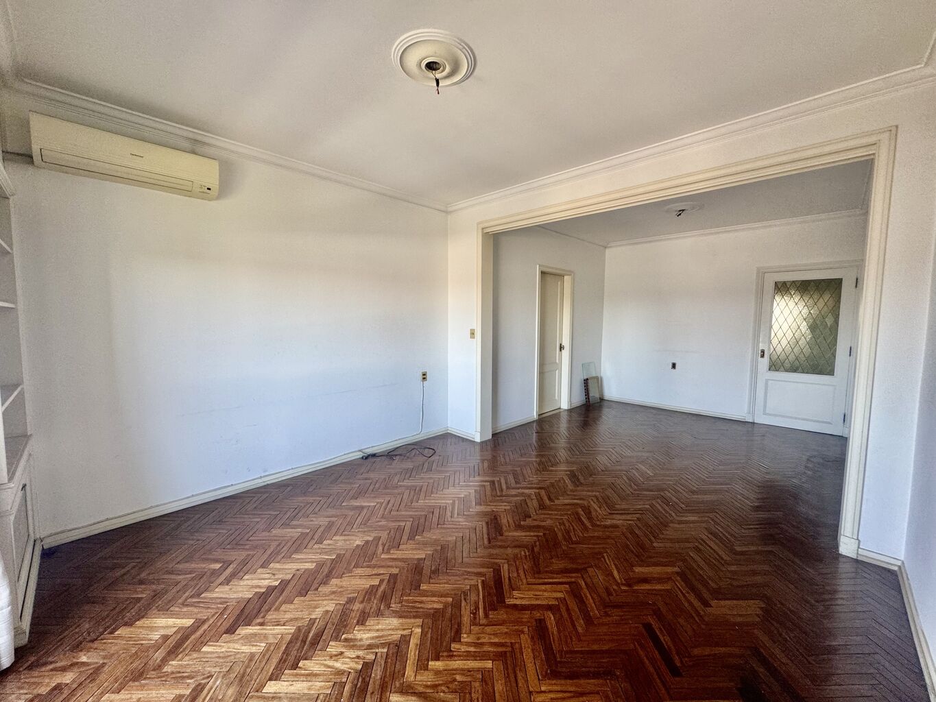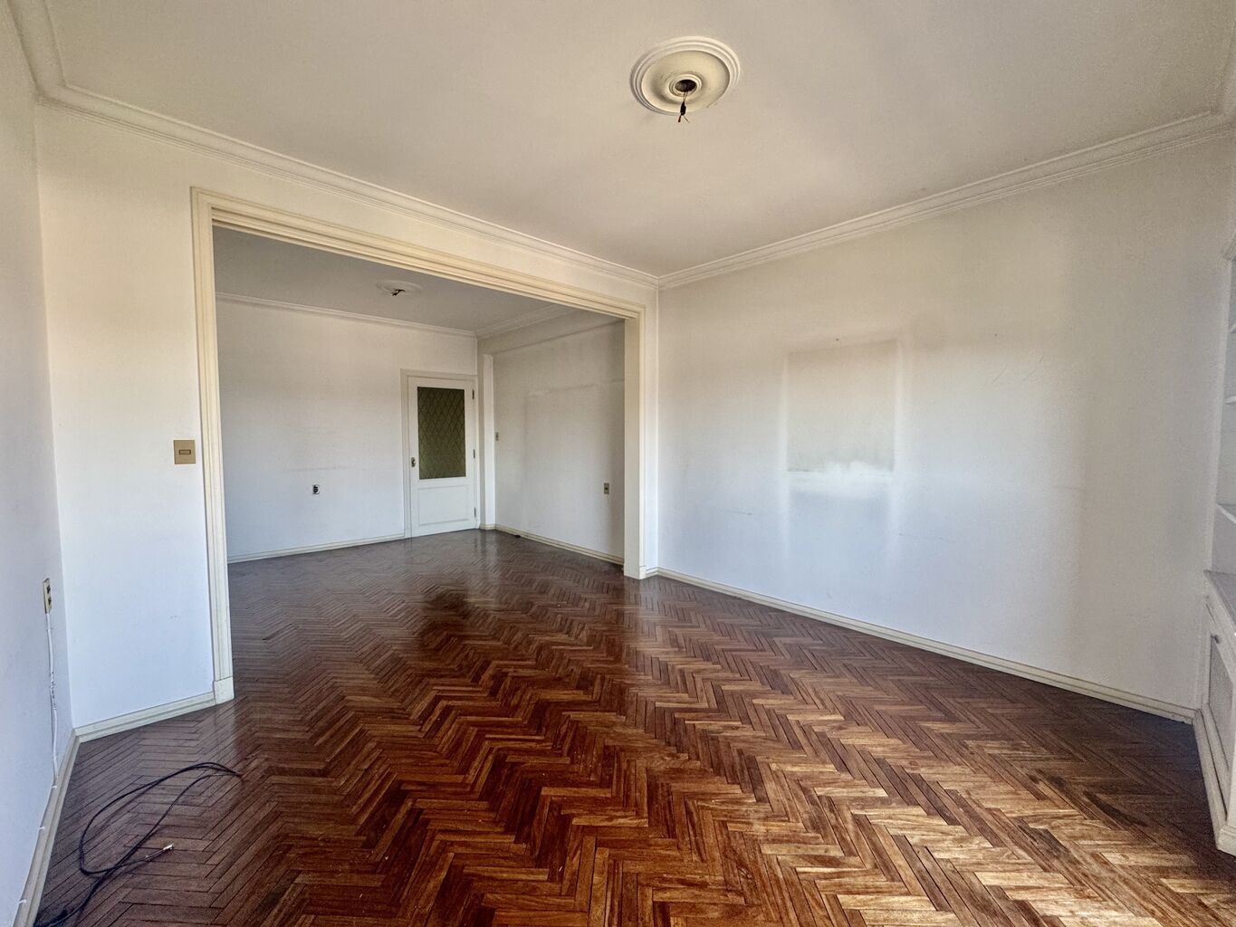 Desarrolla: Hall de entrada, living comedor de muy buen tamaño (doble sala) con pisos de parquet y acceso a balcon frontal.