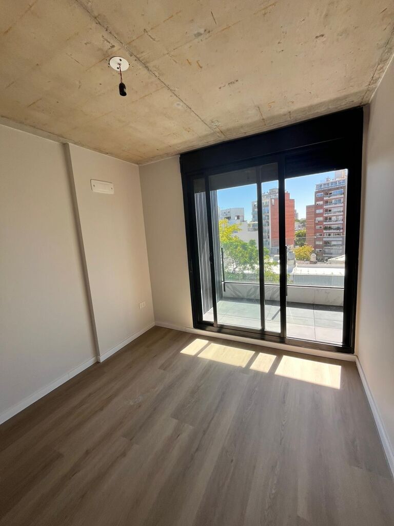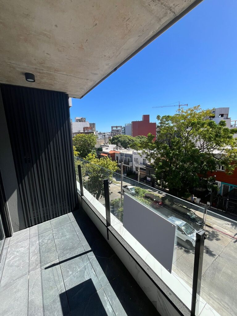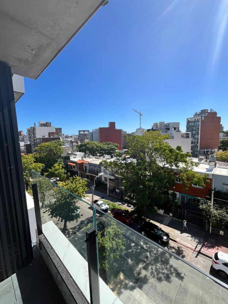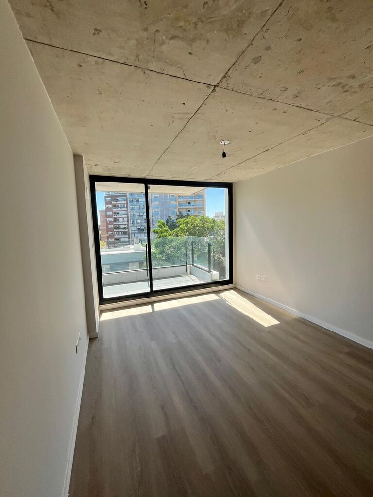 El apartamento se desarrolla con un amplio living comedor y dormitorio con placar al frente lo que hace que la terraza se desarrolle en todo el largo del apartamento con vistas panorámicas muy despejadas y arboladas.